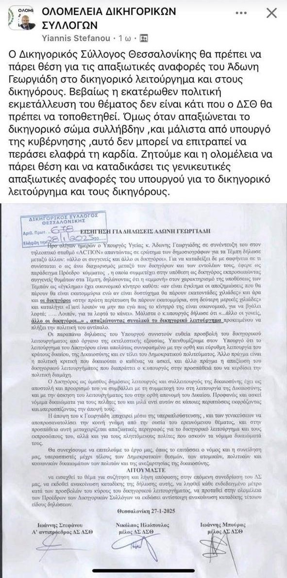 Πιο συγκεκριμένα, δικηγόροι, μέλη του ΔΣ, ζητούν με αίτημα τους να πάρει θέση και η Ολομέλεια των Προέδρων των Δικηγορικών Συλλόγων και να καταδικαστούν οι γενικεύσεις και προσβλητικές αναφορές του κ. Γεωργιάδη για το δικηγορικό λειτούργημα αλλά και για τους ίδιους τους δικηγόρους.