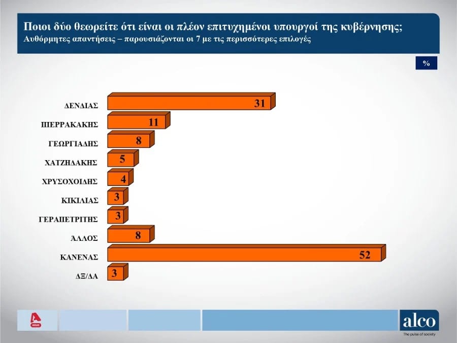 Στο υπουργικό κομμάτι, αν λάβει κανείς υπόψιν του τα παραπάνω δεδομένα, δεν θα έπρεπε να προκαλεί εντύπωση το γεγονός πως «κανένας» δεν είναι επιτυχημένος Υπουργός, σύμφωνα με το εμφατικό 52% των συμμετεχόντων στη δημοσκόπηση. Ο Νίκος Δένδιας είναι ο πιο δημοφιλής Υπουργός με 31%, ενώ ακολουθούν ο Κυριάκος Πιερρακάκης με 11% και ο Άδωνις Γεωργιάδης με 8%.