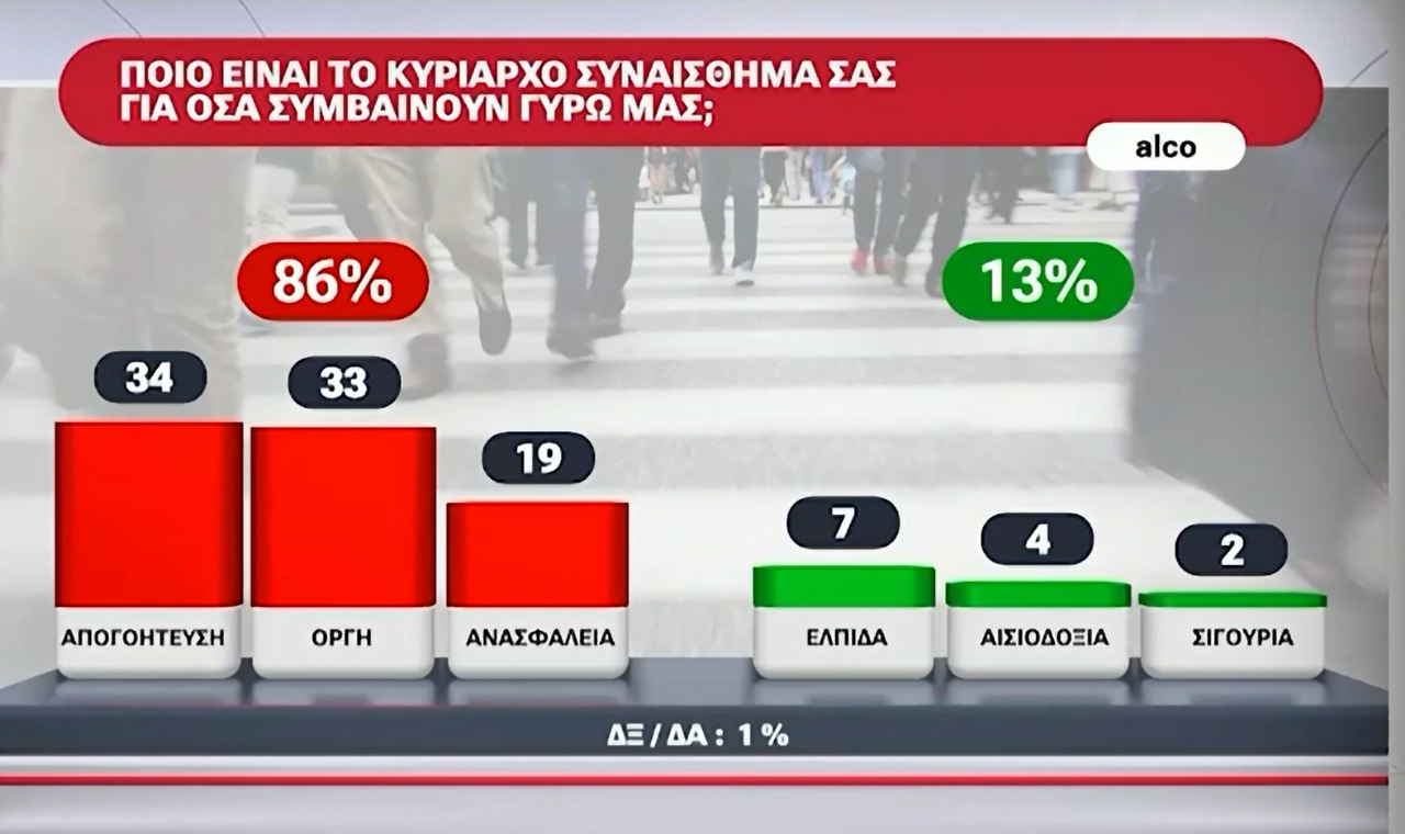 Στο ερώτημα ποιο είναι το κυρίαρχο συναίσθημα για όσα συμβαίνουν γύρω μας, το 86% έχει αρνητική εικόνα (Απογοήτευση, οργή, ανασφάλεια) και μόλις το 13% εξέφρασε θετικές σκέψεις (ελπίδα, αισιοδοξία, σιγουριά).