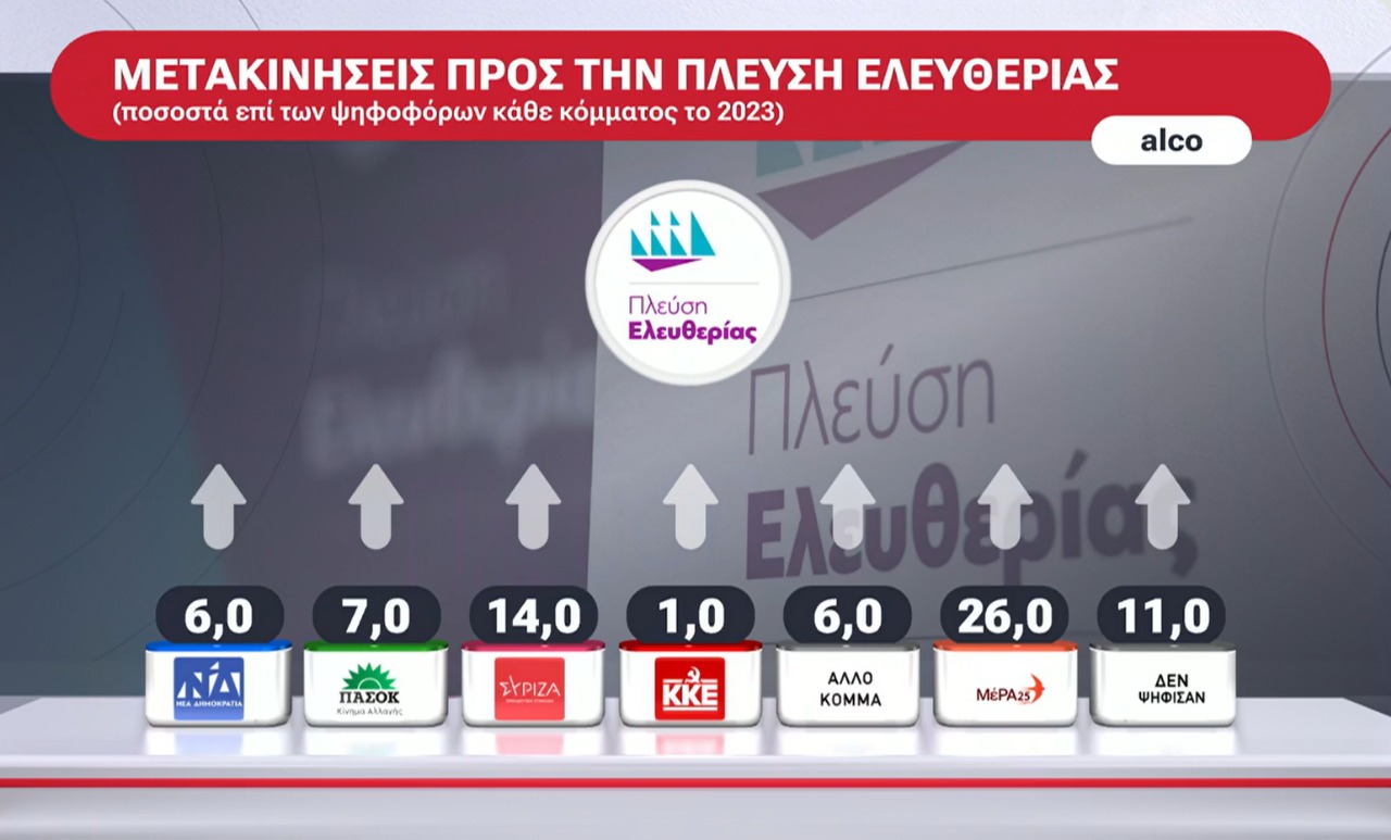 Το ενδιαφέρον στοιχείο της έρευνας της ALCO είναι οι μετακινήσεις προς το κόμμα της Ζωής Κωνσταντοπούλου. Η Πλεύση Ελευθερίας φαίνεται, σύμφωνα με τη δημοσκόπηση, πως αντλεί ψηφοφόρους από όλα τα κόμματα. Είναι προφανές πως τα μεγάλα συλλαλητήρια για τα Τέμπη ενίσχυσαν το κόμμα της κ. Κωνσταντοπούλου, ωστόσο αποτελεί ζήτημα εάν θα καταφέρει να διατηρήσει τα ποσοστά αυτά.