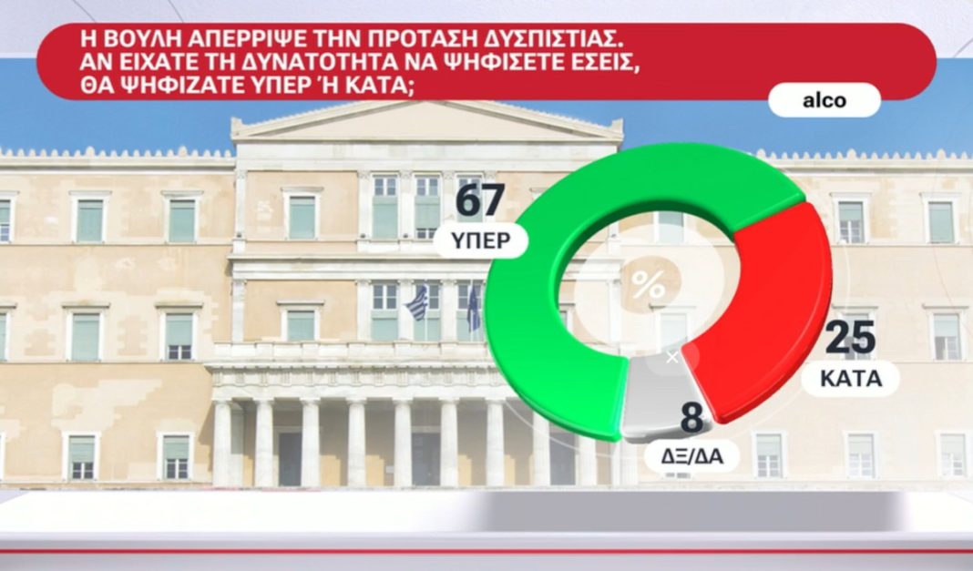 Περί της πρότασης δυσπιστίας, που δεν πέρασε στη Βουλή, το 67% τίθεται υπέρ και το 25% κατά.