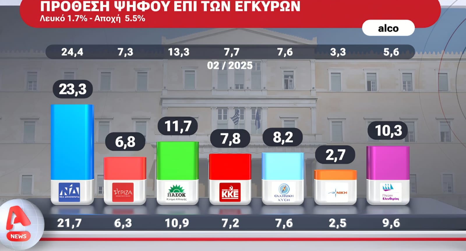 Σύμφωνα με τη νέα δημοσκόπηση που πραγματοποίησε η ALCO για λογαριασμό του Alpha, όλα τα κόμματα παρουσιάζουν δημοσκοπική πτώση, με εξαιρέσεις να αποτελούν η Πλεύση Ελευθερίας (10,3%), της Ζωής Κωνσταντοπούλου, και η Ελληνική Λύση (8,2%) του Κυριάκου Βελόπουλου. Σημαντική είναι η πτώση του ΠΑΣΟΚ στο 11,7%, ενώ η Νέα Δημοκρατία βρίσκεται στο 23,3%, αποδεικνύοντας εκ νέου τη φθορά που έχει υποστεί ο Πρωθυπουργός και το κυβερνών κόμμα.
