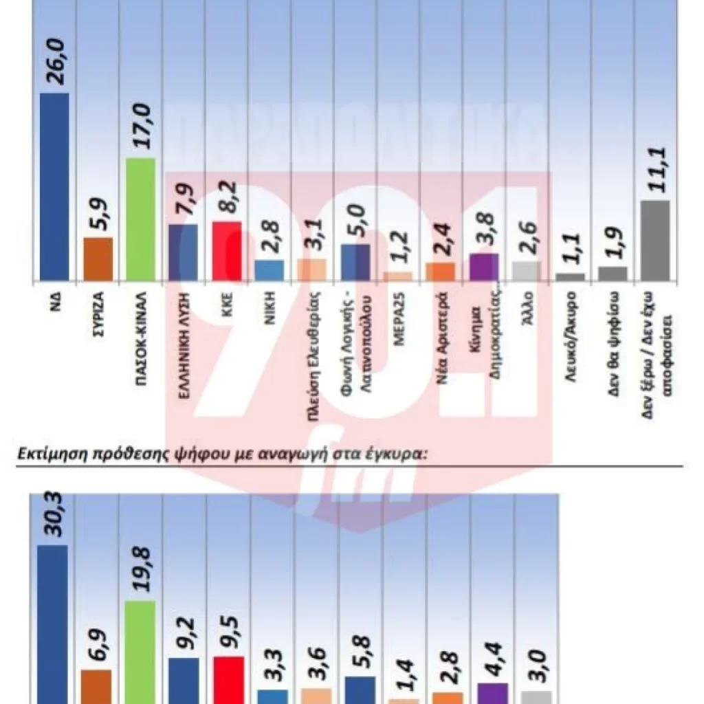 Η ΝΔ με 26% κρατά σταθερά ένα προβάδισμα ασφαλείας από το εδραιωμένο πλέον στη θέση της αξιωματικής αντιπολίτευσης ΠΑΣΟΚ, που συνεχίζει με το 17% να καταγράφει επιδόσεις μεγαλύτερες από αυτές των τελευταίων εκλογών.