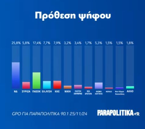 Σύμφωνα με τη δημοσκόπηση της GPO για το ραδιόφωνο των «Παραπολιτικών 90,1 FM», που δόθηκε στη δημοσιότητα σήμερα Δευτέρα (25.11.24) ο ΣΥΡΙΖΑ πέφτει πλέον στο 5,8%.