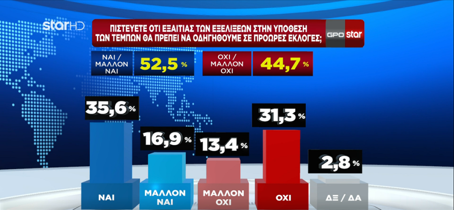 Σύμφωνα με την τελευταία δημοσκόπηση της GPO, η συντριπτική πλειοψηφία των ερωτηθέντων «βλέπει» ξεκάθαρες ευθύνες της κυβέρνησης στο σιδηροδρομικό δυστύχημα των Τεμπών, ενώ πιστεύει ακράδαντα πως υφίσταται προσπάθεια συγκάλυψης από πλευράς της. Ταυτόχρονα, περίπου 7 στους 10 θεωρούν πως η κυβέρνηση έχει χάσει τη νομιμοποίησή της, ενώ είναι η πρώτη φορά που πάνω από τους μισούς είναι υπέρ της διενέργειας πρόωρων εκλογών.