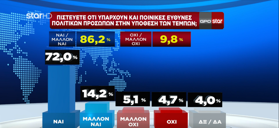 Η ίδια δημοσκόπηση – «σφαλιάρα» για την κυβέρνηση, η οποία παρουσιάστηκε στο κεντρικό δελτίο ειδήσεων του STAR, αποκαλύπτει ότι το 86,2% πιστεύουν ότι υπάρχουν και ποινικές ευθύνες πολιτικών προσώπων για το δυστύχημα στα Τέμπη. Μάλιστα, ακόμα και οι ψηφοφόροι της ΝΔ βλέπουν ευθύνη της κυβέρνησης στο δυστύχημα (58,6%) και ποινικές ευθύνες πολιτικών (65,6%).