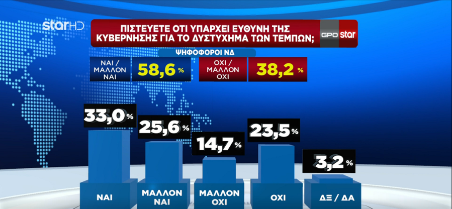 Δημοσκόπηση κόλαφος για την κυβέρνηση Μητσοτάκη από την GPO παρουσιάστηκε στο δελτίο ειδήσεων του Star. Μια μέτρηση που δείχνει πως η κυβέρνηση Μητσοτάκη είναι πλέον απονομιμοποιημένη απο 7 στους 10 Έλληνες.