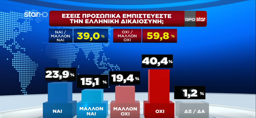 Καμία εμπιστοσύνη στην Δικαιοσύνη από το 60% των πολιτών μετά τους χειρισμούς στην υπόθεση των Τεμπών.
