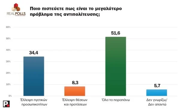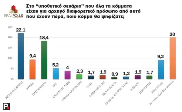 Τα –σε μεγάλο βαθμό προσωποκεντρικά– αδιέξοδα της αντιπολίτευσης και ειδικά του ΠΑΣΟΚ και του ΣΥΡΙΖΑ αναδεικνύονται και από την απάντηση στο ερώτημα «Στο υποθετικό σενάριο, όπου όλα τα κόμματα είχαν για αρχηγό διαφορετικό πρόσωπο από αυτό που έχουν τώρα, ποιο κόμμα θα ψηφίζατε» (Πίνακας VIIΙ): Οι πολίτες απαντούν 22,1% ΝΔ, που κρατάει τα ποσοστά της σε σχέση με την προηγούμενη μέτρηση, ενώ στην περίπτωση του ΠΑΣΟΚ τα ποσοστά ανεβαίνουν εντυπωσιακά στο 18,4% (από 10%) και του ΣΥΡΙΖΑ στο 9,4% (από 4,6%), μια έμμεση αποδοκιμασία του δείγματος στις ηγεσίες του Νίκου Ανδρουλάκη και του Σωκράτη Φάμελλου αντίστοιχα.