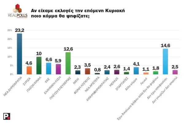 Στο ερώτημα, λοιπόν, αν είχαμε εκλογές την προσεχή Κυριακή ποιο κόμμα θα ψηφίζατε, η ΝΔ παραμένει πρώτη με 23,2%, έχοντας μάλιστα αυξήσει τα ποσοστά της από την προηγούμενη μέτρηση (21,2%). Η Πλεύση Ελευθερίας εμφανίζεται δεύτερη με 12,6%, αφήνοντας πίσω το ΠΑΣΟΚ-ΚΙΝΑΛ που με 10%, έχει χάσει 1,2%. Ακολουθεί τέταρτο το ΚΚΕ με 6,6%, πέμπτη η Ελληνική Λύση του Κυριάκου Βελόπουλου με 5,9% και έκτος ο ΣΥΡΙΖΑ με το γλίσχρο 4,6%. Η Φωνή Λογικής της Αφροδίτης Λατινοπούλου έχει υποχωρήσει στο 3,5%. Εκτός ορίου κοινοβουλευτικής εκπροσώπησης το ΜέΡΑ25, το Κίνημα Δημοκρατίας και η Νίκη, ενώ ουσιαστικά ανύπαρκτη είναι η Νέα Αριστερά (Πίνακας Ι).