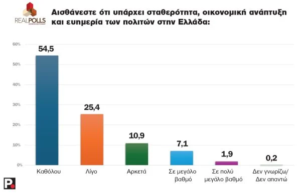 Οι πολίτες (Πίνακας ΙΙΙ) αισθάνονται ότι η χώρα δεν κινείται προς τη σωστή κατεύθυνση και ότι οι πολιτικές και κοινωνικές συνθήκες δεν βελτιώνονται. Χαρακτηριστικό είναι ότι στο ερώτημα: «Αισθάνεστε ότι υπάρχει σταθερότητα, οικονομική ανάπτυξη και ευημερία των πολιτών στην Ελλάδα;», που αποτελεί και το κυρίαρχο αφήγημα της κυβέρνησης, γύρω στο 80% των πολιτών απαντούν «Καθόλου» και «Λίγο».
