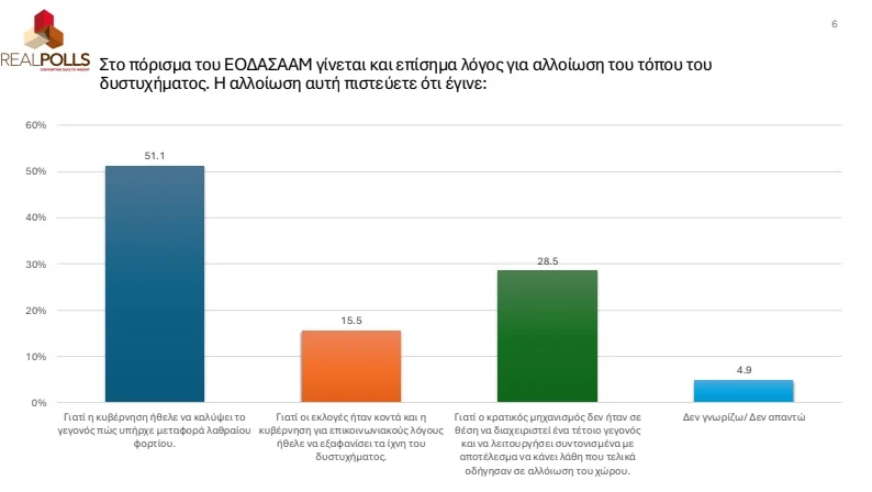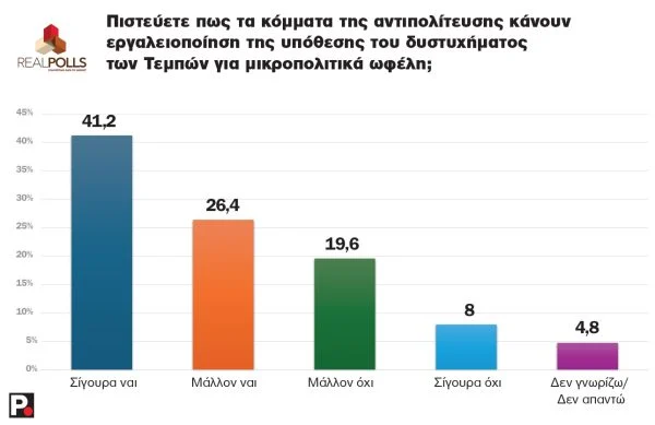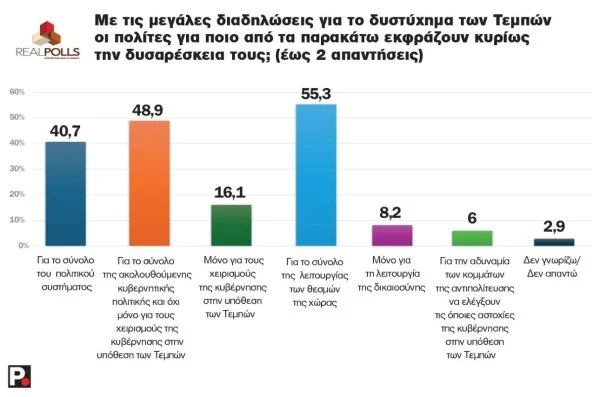 Τα στοιχεία αυτά έρχονται να επιβεβαιωθούν από το εύρημα ότι τόσο η κυβέρνηση, όσο και η αντιπολίτευση δεν έχουν επίγνωση των πραγματικών αναγκών της κοινωνίας, σε ποσοστά 70% και 66% αντίστοιχα. Φυσικά η κυβέρνηση παραμένει στο στόχαστρο. Είναι χαρακτηριστικό ότι στο ερώτημα που προκύπτει μετά το πόρισμα του ΕΟΔΑΣΑΑΜ σχετικά με αλλοίωση του τόπου του πολύνεκρου σιδηροδρομικού δυστυχήματος, οι μισοί εξακολουθούν να πιστεύουν ότι αυτή έγινε για να καλύψει η κυβέρνηση λαθραίο φορτίο στα μοιραία τρένα, ενώ ένα 15,5% εκτιμά ότι το περιβόητο «μπάζωμα» έγινε επειδή οι εκλογές ήταν κοντά και χρειαζόταν μια επικοινωνιακή διαχείριση του προβλήματος.