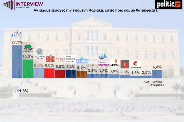 Σύμφωνα με τη δημοσκόπηση, η Νέα Δημοκρατία παραμένει στην κορυφή με ποσοστό 27,1%, αλλά το ΠΑΣΟΚ – Κίνημα Αλλαγής εδραιώνεται στη δεύτερη θέση και είναι κοντά της (15,3%), ενώ το ΚΚΕ και η Ελληνική Λύση εμφανίζονται να ισοψηφούν στην τρίτη θέση με 8%.