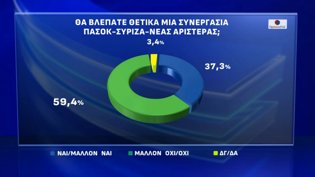 Στην ερώτηση εάν «θα βλέπατε θετικά» τη συνεργασία ΠΑΣΟΚ, ΣΥΡΙΖΑ και Νέας Αριστεράς το 59% απαντά «όχι» όμως ένα ιδιαίτερα σημαντικό ποσοστό απαντά «ναι» στο 37%. Θυμίζουμε πως η ΝΔ στην εκτίμηση ψήφου στην ίδια δημοσκόπηση συγκεντρώνει 30% ενώ στην πρόθεση 25%.