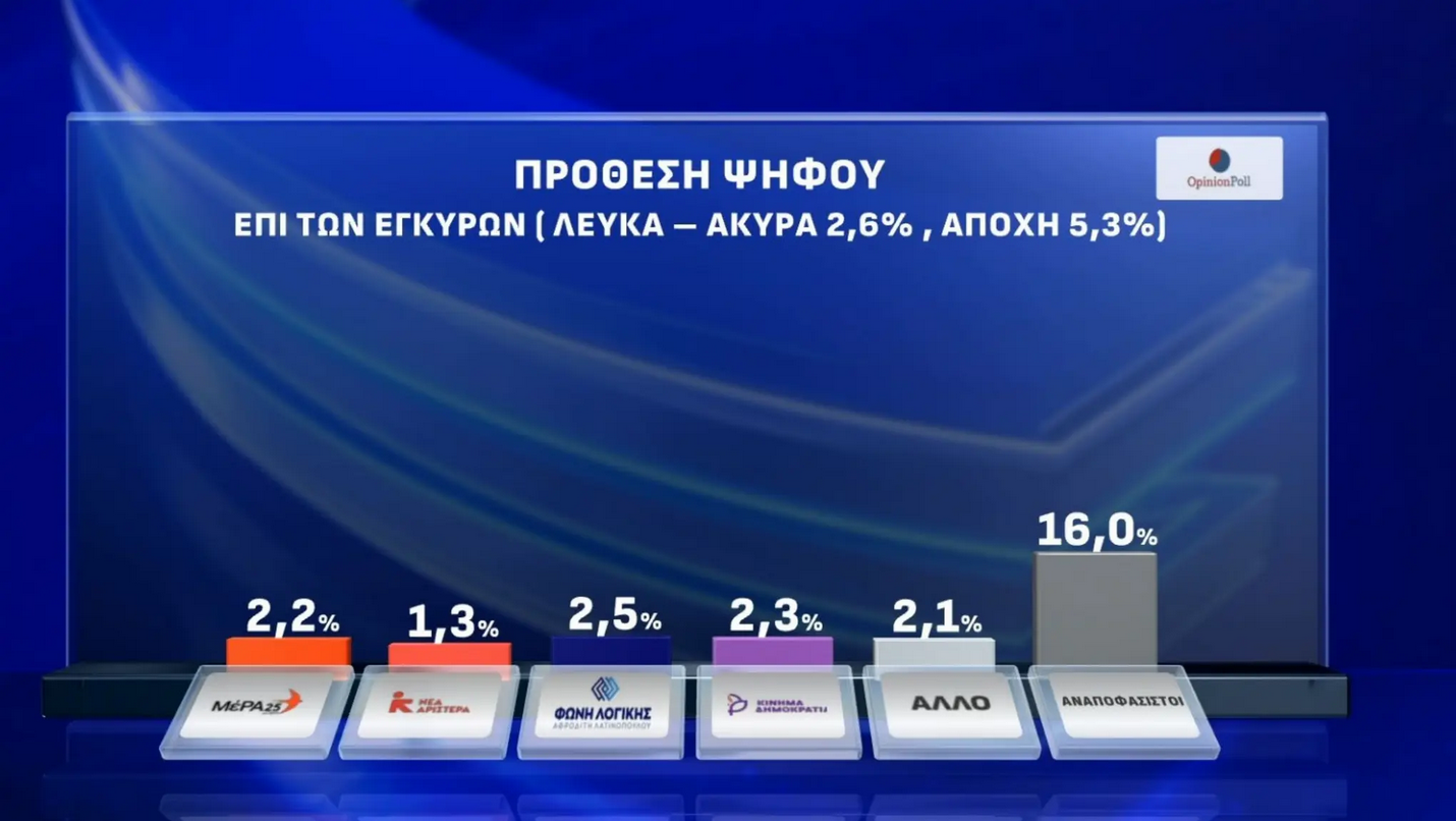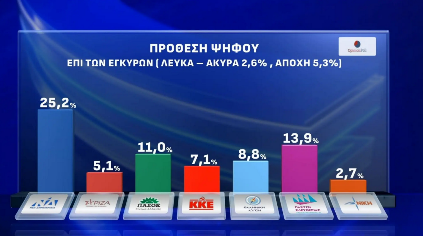 Στη δημοσκόπηση της Opinion Poll που παρουσιάστηκε στο κεντρικό δελτίο ειδήσεων του Action 24, η Νέα Δημοκρατία στην πρόθεση ψήφου επί των έγκυρων, βρίσκεται στο 25,2% και έχει προβάδισμα 11,3 ποσοστιαίων μονάδων έναντι της Πλεύσης Ελευθερίας (13,9%). Το ΠΑΣΟΚ είναι στο 11% και ακολουθούν Ελληνική Λύση (8,8%), ΚΚΕ (7,1%) και ΣΥΡΙΖΑ (5,1%), ενώ το 16% δηλώνουν αναποφάσιστοι. Λατινοπούλου και Κασσελάκης βρίσκονται στο 2,5 και 2,3 αντίστοιχα μακριά από το όριο εισόδου στη Βουλή.