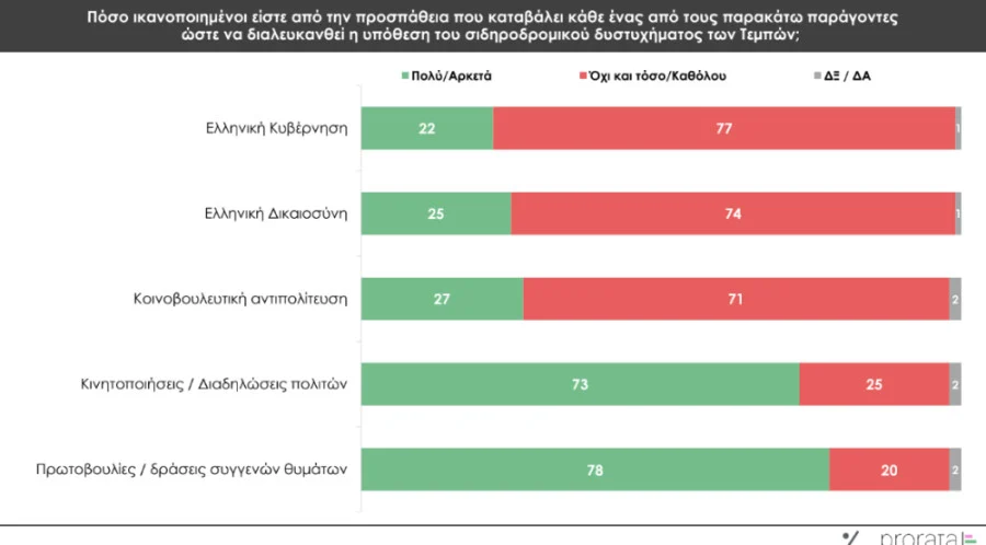 Δημοσκόπηση της Prorata αναδεικνύει τεράστια αγανάκτηση των πολιτών για το έγκλημα των Τεμπών με 7 στους 10 πολίτες να μην πιστεύουν ότι τελικά θα αποδοθεί δικαιοσύνη κάτι που φανερώνει την μεγάλη έλλειψη εμπιστοσύνης και την κρίση θεσμών στην Ελλάδα.
