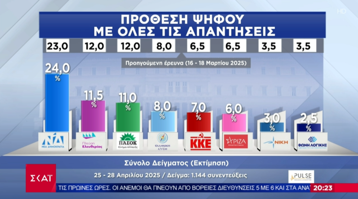 Προβάδισμα 12,5 μονάδων της Νέας Δημοκρατίας καταγράφει νέα δημοσκόπηση της Pulse για λογαριασμό του ΣΚΑΙ, ενώ η ανοδική πορεία της Πλεύσης Ελευθερίας σταματά, όσο παράλληλα το ΠΑΣΟΚ σημειώνει νέες απώλειες.