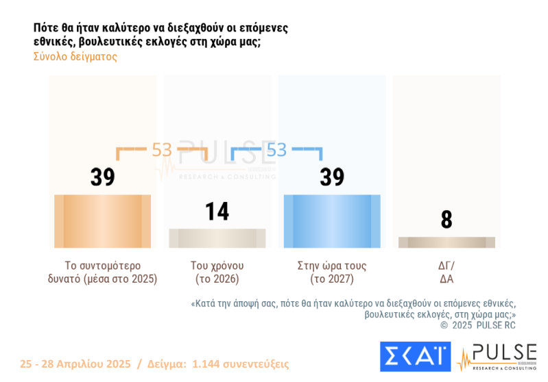 Ακόμη, ένα από τα σημαντικότερα ευρήματα της έρευνας είναι πως πάνω από τους μισούς- το 53%- τάσσονται υπέρ των πρόωρων εκλογών.