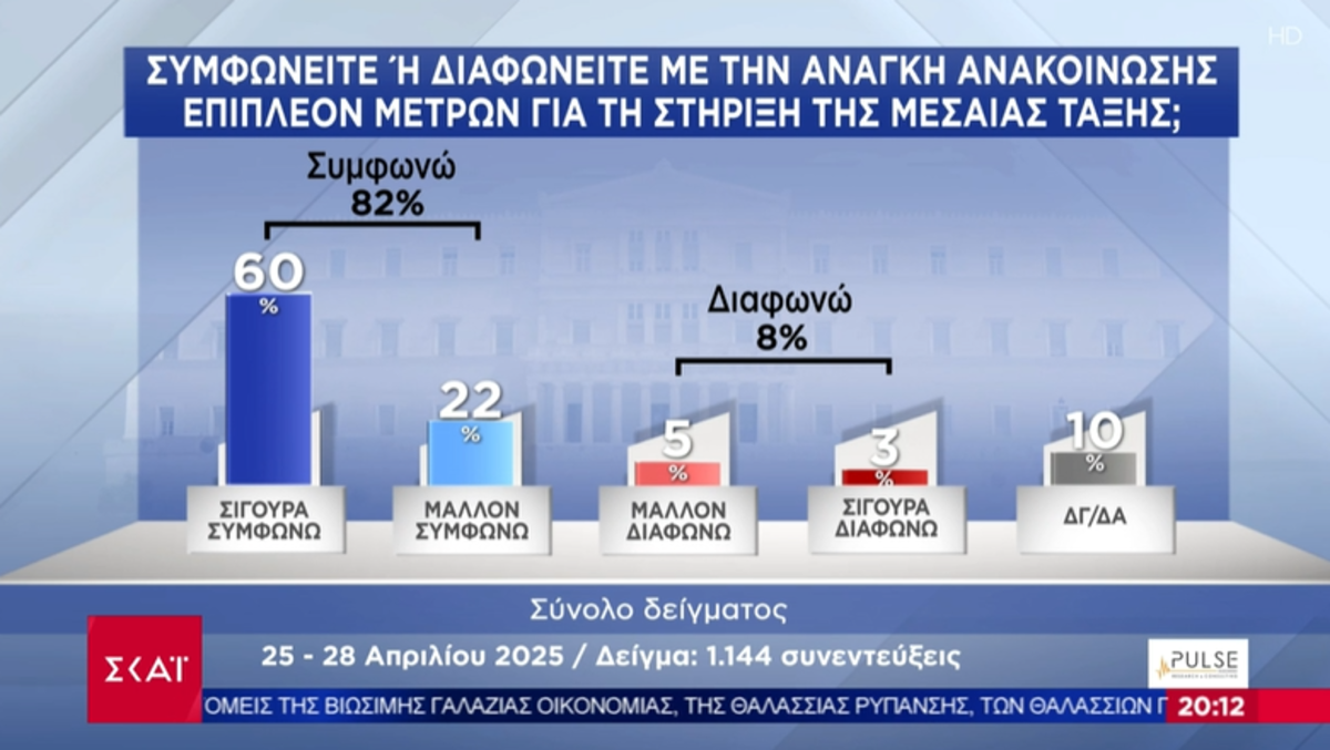 Ειδικότερα, στο ερώτημα «Συμφωνείτε ή διαφωνείτε με την ανάγκη ανακοίνωσης επιπλέον μέτρων για τη στήριξη της μεσαίας τάξης» όσοι αυτοπροσδιορίζονται ως μεσαία τάξη απαντούν: