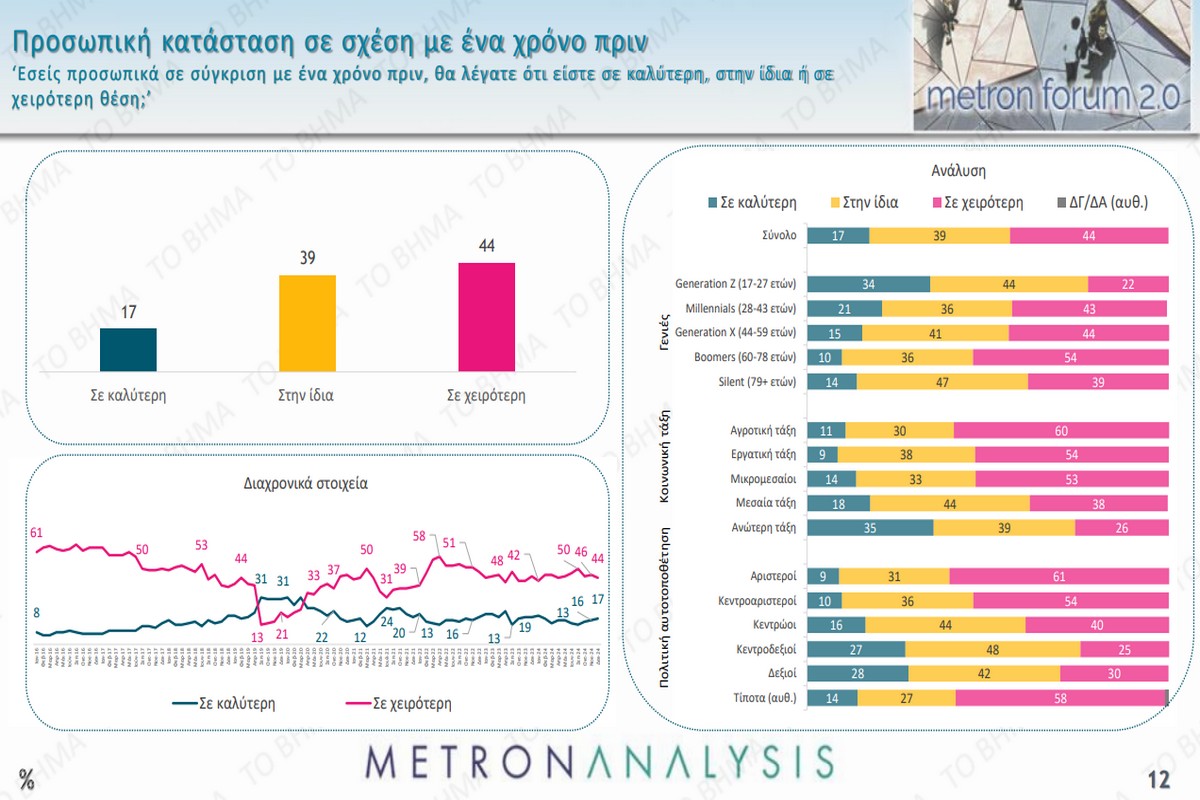 Η απογοήτευση που άφησε το 2024 αποτυπώνεται καλύτερα στην δημοσκόπηση της Metron Analysis, που δημοσιεύτηκε στις 19 Δεκεμβρίου. Μόλις το 17% των ερωτηθέντων βρίσκεται σε καλύτερη κατάσταση σε σχέση με την προηγούμενη χρονιά, ενώ στην ίδια ή σε χειρότερη είναι το 83%.