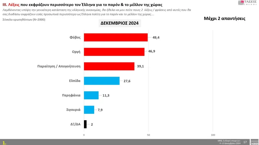 Τέλος, σε δημοσκόπηση της MRB που δημοσιεύτηκε στις 18 Δεκεμβρίου, τους Έλληνες πολίτες φαίνεται πως εκφράζει καλύτερα η λέξη «φόβος» με ποσοστό 49,4% για το παρόν και το μέλλον της χώρας. Ακολουθούν η «οργή» με 46,9% και η «παραίτηση/απογοήτευση» με 39,1%.