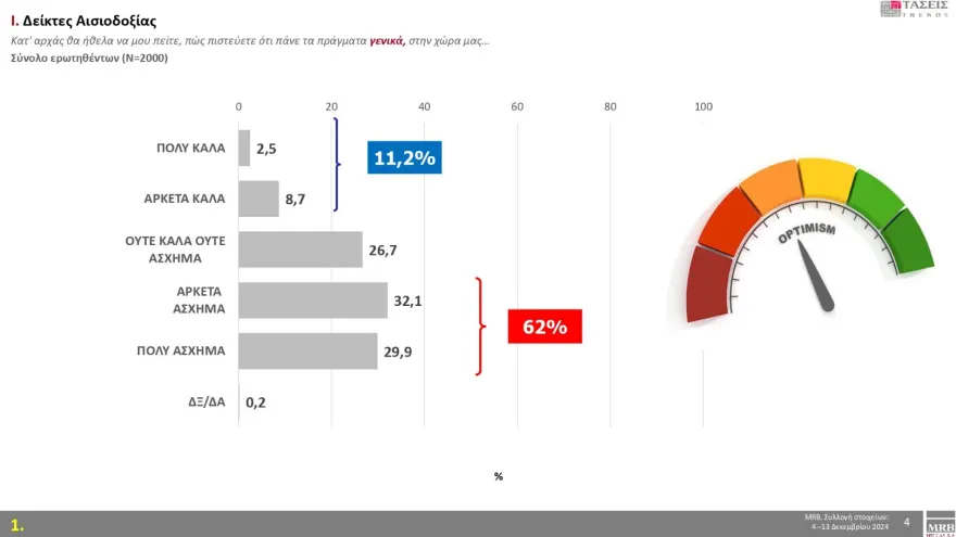 Αντίστοιχα, στους δείκτες αισιοδοξίας και στο ερώτημα «πώς πιστεύετε ότι πάνε τα πράγματα γενικά στη χώρα μας», το 62%, εμφανώς απογοητευμένο απαντά «Πολύ – Αρκετά άσχημα» ενώ μόλις το 11,2% απαντά «Πολύ-Αρκετά καλά».