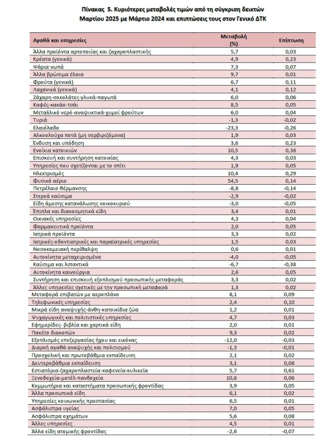 Η αύξηση του Γενικού ΔΤΚ κατά 2,4% τον μήνα Μάρτιο 2025, σε σύγκριση με τον αντίστοιχο Δείκτη του Μαρτίου 2024, προήλθε κυρίως από τις μεταβολές στις ακόλουθες ομάδες αγαθών και υπηρεσιών: 1. Από τις αυξήσεις των δεικτών κατά: