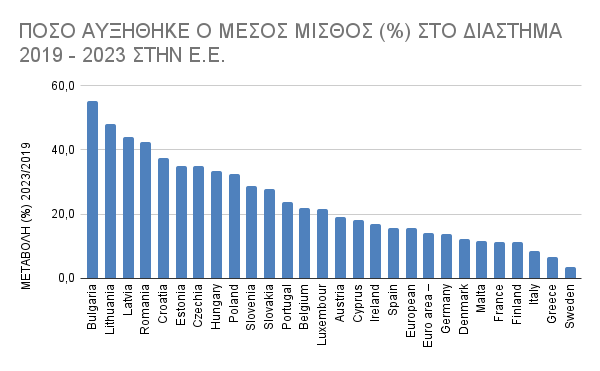 Αν δούμε πόσο αυξήθηκε ο μέσος μισθός από το 2019 μέχρι το 2023, τα στοιχεία δείχνουν ότι η αύξηση στην Ελλάδα ήταν 6,6%, η δεύτερη χαμηλότερη αύξηση στην Ε.Ε., πάνω μόνο από τη Σουηδία, όπου η αύξηση ήταν 3,3%, αλλά βέβαια οι μισθοί στη σκανδιναβική αυτή χώρα ήταν 44.619 ευρώ το χρόνο, οπότε δεν υπάρχει σύγκριση.
