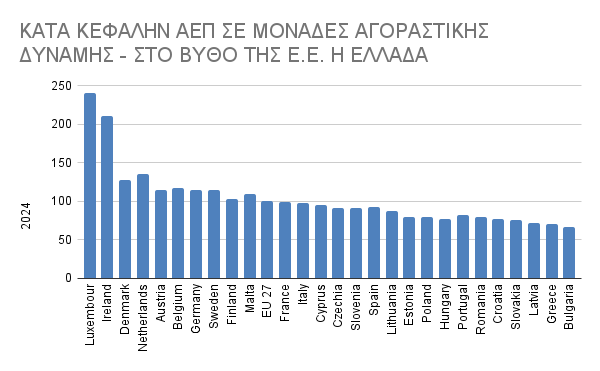 Η Ελλάδα βρέθηκε και το 2024 στο «βυθό» της ΕΕ σχετικά με το κατά κεφαλήν εισόδημα, αφού σύμφωνα με τα επίσημα στοιχεία της Eurostat που ανακοινώθηκαν την περασμένη εβδομάδα, το κατά κεφαλήν ΑΕΠ σε μονάδες αγοραστικής δύναμης είναι το προτελευταίο στην ΕΕ, πάνω μόνο από την Βουλγαρία.