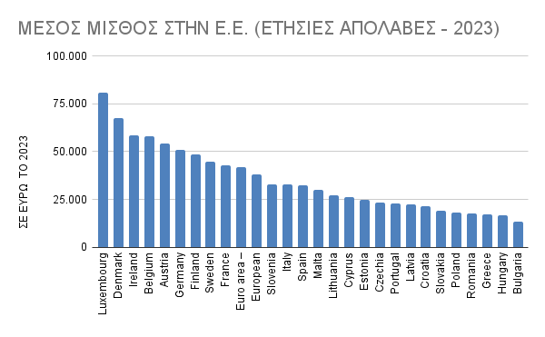 Δηλαδή στην Ελλάδα έχουμε και χαμηλές αμοιβές και υψηλές τιμές. Όμως αν δούμε τους μισθούς σε ονομαστικούς όρους, χωρίς να υπολογιστεί το επίπεδο των τιμών, η Ελλάδα είναι τρίτη από το τέλος ανάμεσα στις χώρες της ΕΕ, πάνω μόνο από την Ουγγαρία και την Βουλγαρία. Τα τελευταία συγκριτικά στοιχεία για τις χώρες της ΕΕ δείχνουν ότι το 2023 ο μέσος μισθός, σε ετήσια βάση, στην Ελλάδα ήταν 17.013 ευρώ, κάτω από το μισό του μέσου όρου στην ευρωζώνη που ήταν 41.848 ευρώ, όπως φαίνεται και στο παρακάτω διάγραμμα.