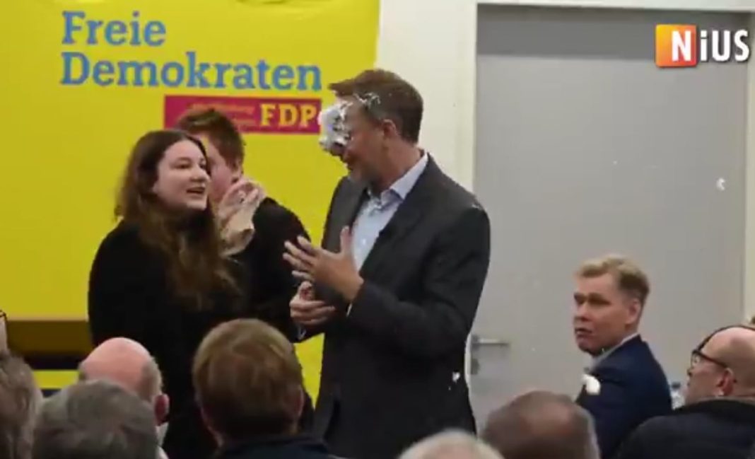 Ο ηγέτης του FDP και πρώην Υπουργός Οικονομικών της Γερμανίας, Κρίστιαν Λίντνερ, κατά τη διάρκεια της προεκλογικής του ομιλίας στο κρατίδιο του Μεκλεμβούργου-Δυτικής Πομερανίας της Γερμανίας, δέχθηκε ξαφνικά μια τούρτα στο πρόσωπο.
