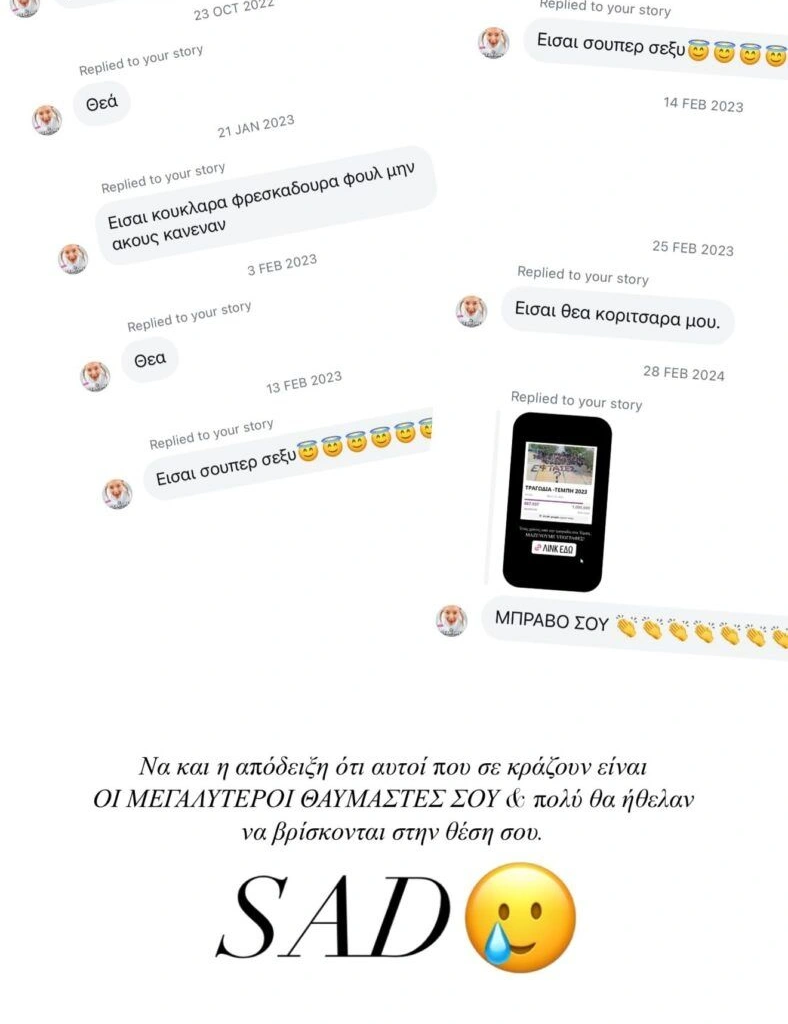 «Είσαι θεά, σε αγαπώ και είσαι κουκλάρα», είναι μόνο μερικά από τα μηνύματα που της έστελνε από τον Ιούλιο του 2022.