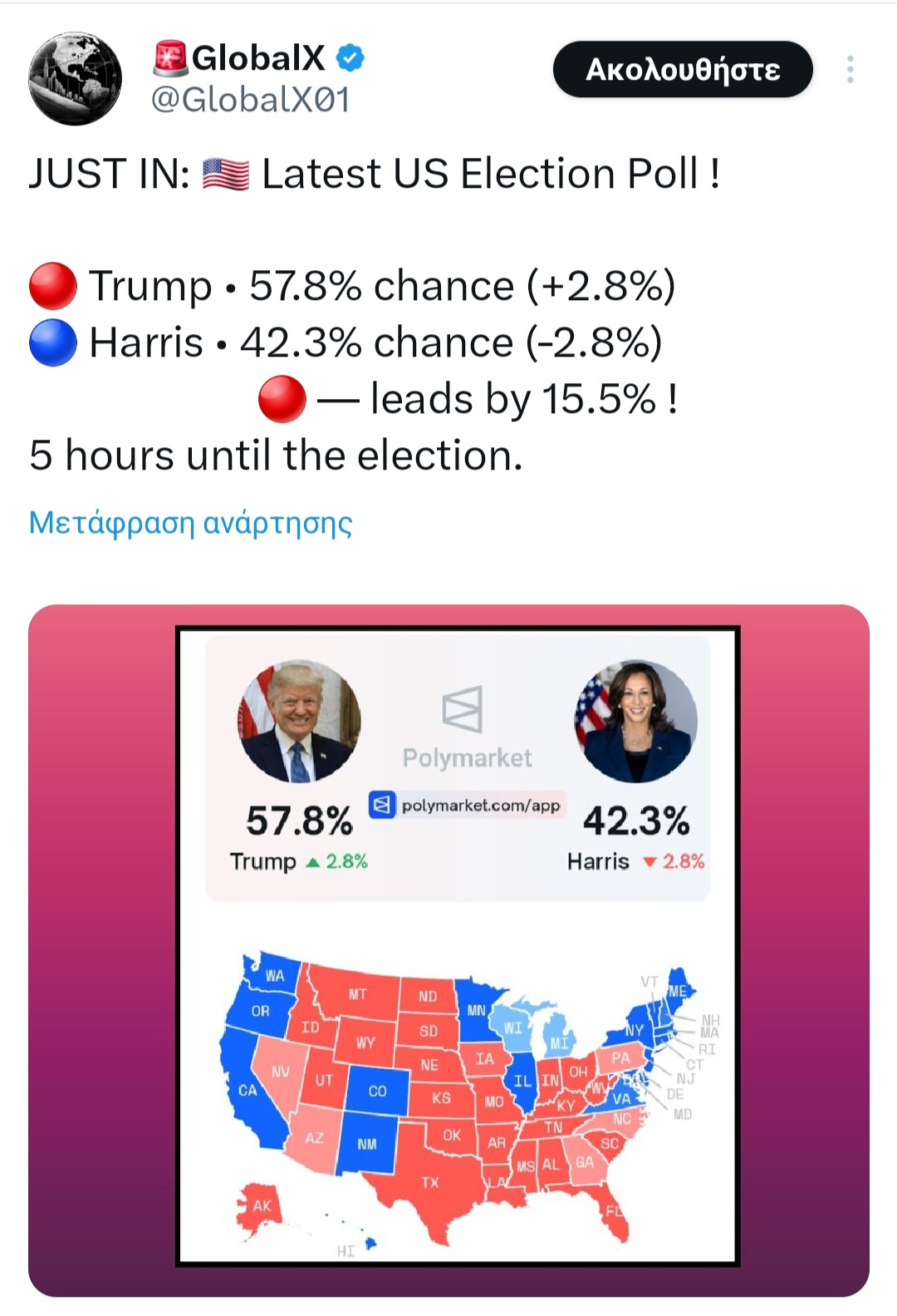Στις 04:00 (Ελλάδα) – Κλείνουν οι κάλπες σε 15 πολιτείες, μεταξύ τους το Μίσιγκαν και το Ουισκόνσιν που αποτελούν πολιτείες κλειδιά και είναι πραγματικά αμφίρροπες στις δημοσκοπήσεις. Θα είναι ένα από τα τελευταία “κανονάκια” της Χάρις αν θέλει να επικρατήσει στο τέλος διότι το πιθανότερο είναι πως μέχρι εκείνη την ώρα σύμφωνα με τις δημοσκοπήσεις το αποτέλεσμα θα είναι “δύσκολο” για εκείνη.