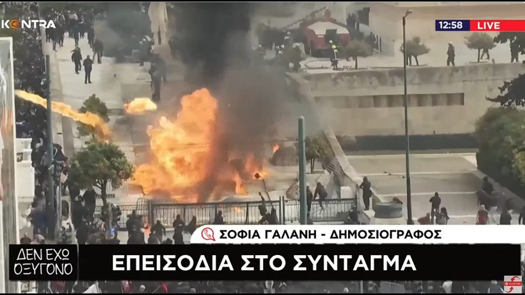 Στη συνέχεια οι ίδιες ομάδες κινήθηκαν προς το προαύλιο της Βουλής και άρχισαν να πετούν βόμβες μολότοφ, με αποτέλεσμα να ξεσπάσει φωτιά στο κουβούκλιο του αξιωματικού αλλαγής στο Μνημείο του Αγνώστου Στρατιώτη.
