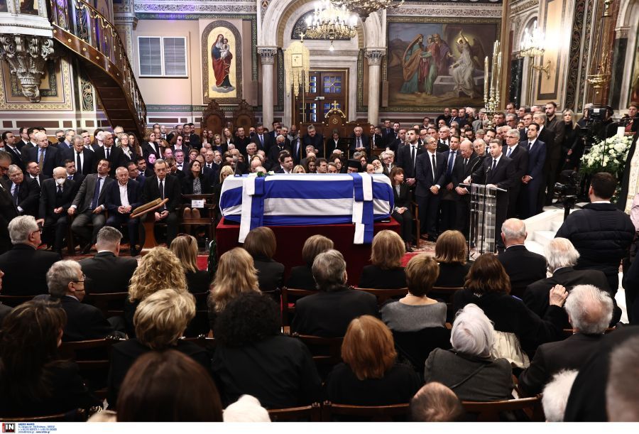 Το φέρετρο του πρώην πρωθυπουργού ήταν σκεπασμένο με την ελληνική σημαία. Στην Μητρόπολη βρίσκεται από νωρίς η οικογένειά του ενώ όπως φαίνεται στις φωτογραφίες στη Μητρόπολη βρέθηκαν οι Βενιζέλος και Στουρνάρας .