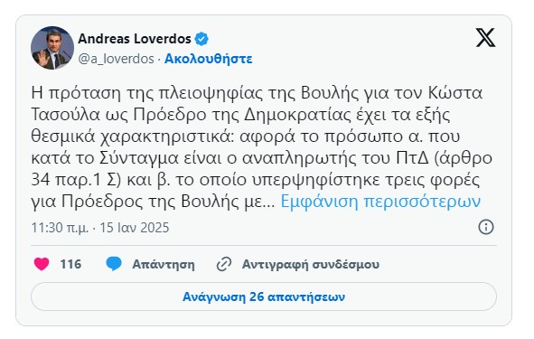 Με ανάρτησή του στα δίκτυα κοινωνικής δικτύωσης σχολίασε τη πρόταση για τον Κωνσταντίνο Τασούλα.