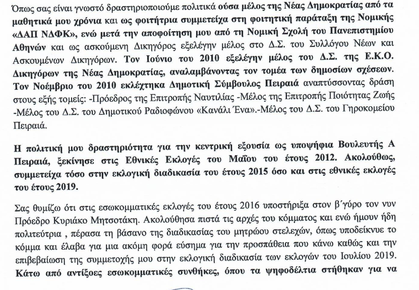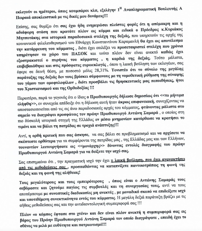 «Σας δηλώνω, ότι πλέον δεν επιθυμώ να ευρίσκομαι ως εγγεγραμμένο μέλος στο κόμμα της Ν.Δ. με πρόεδρο τον κ. Κυριάκο Μητσοτάκη διότι έχει μεταλλάξει τις αρχές του ως κόμματος και προέβη αντιδεολογικά στη διαγραφή του Πρώην Πρωθυπουργού Αντώνη Σαμαρά», καταλήγει.