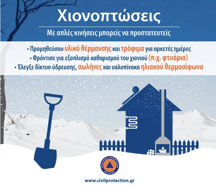Η γενική γραμματεία Πολιτικής Προστασίας (www.civilprotection.gr) του υπουργείου Προστασίας του Πολίτη, έχει ενημερώσει τις αρμόδιες υπηρεσιακά εμπλεκόμενες κρατικές υπηρεσίες, καθώς και τις περιφέρειες και τους δήμους της χώρας, ώστε να βρίσκονται σε αυξημένη ετοιμότητα πολιτικής προστασίας, προκειμένου να αντιμετωπίσουν άμεσα τις επιπτώσεις από την εκδήλωση των έντονων καιρικών φαινομένων.