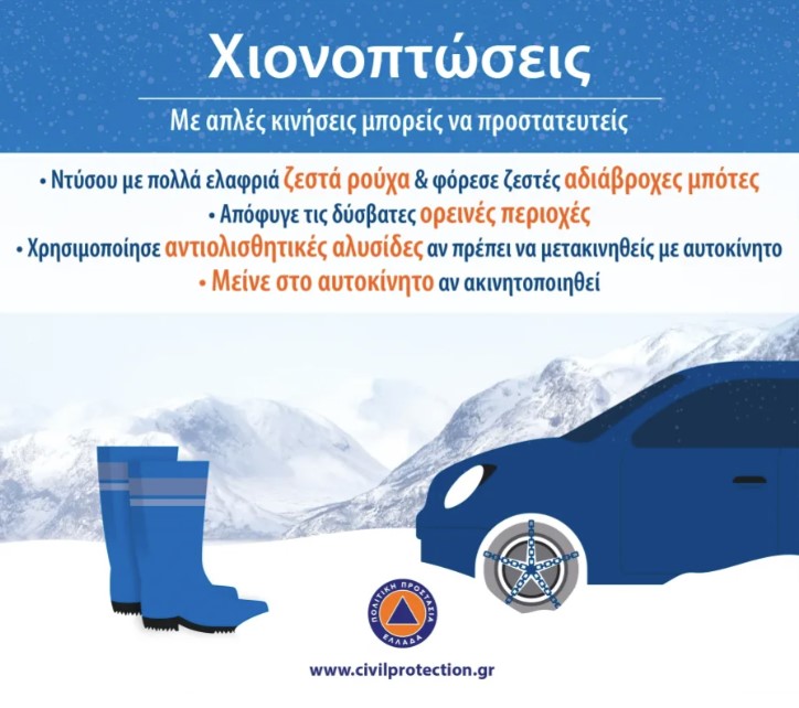 - Προσέξτε τις μετακινήσεις σας σε περιοχές όπου προβλέπονται χιονοπτώσεις.