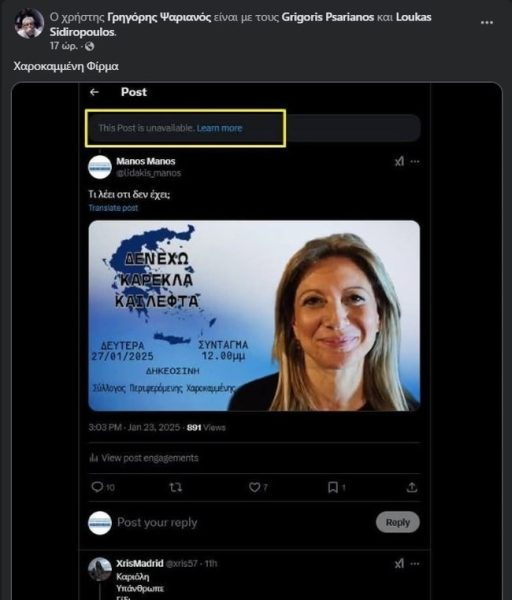 Παράλληλα, κοινοποίησε στον λογαριασμό του αρκετές αναρτήσεις με προσβλητικό περιεχόμενο για την ίδια, ή αναρτήσεις που αφήνουν υπόνοιες ότι όσα κάνει είναι “για τα λεφτά και την καρέκλα”.