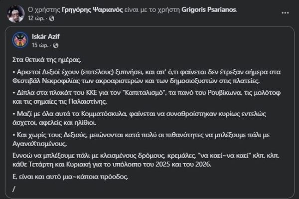 Με ένα μπαράζ χυδαίων και προκλητικών αναρτήσεων σχολίασε ο Γρηγόρης Ψαριανός τις χθεσινές μεγάλες διαδηλώσεις ανά την χώρα με σύνθημα “Δεν έχω οξυγόνο”, στη μνήμη των θυμάτων των Τεμπών.