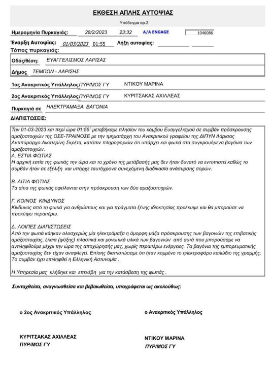 «Γνωρίζει, όπως όλοι όσοι ασχολούνται με την τραγωδία των Τεμπών, ότι στην πρώτη έκθεση αυτοψίας που συνέταξαν οι ανακριτικοί υπάλληλοι της Πυροσβεστικής, την 1η Μαρτίου 2023, αναφερόταν ξεκάθαρα ότι τα αίτια της φωτιάς οφείλονται στην πρόσκρουση των δύο αμαξοστοιχιών», συμπληρώνουν.