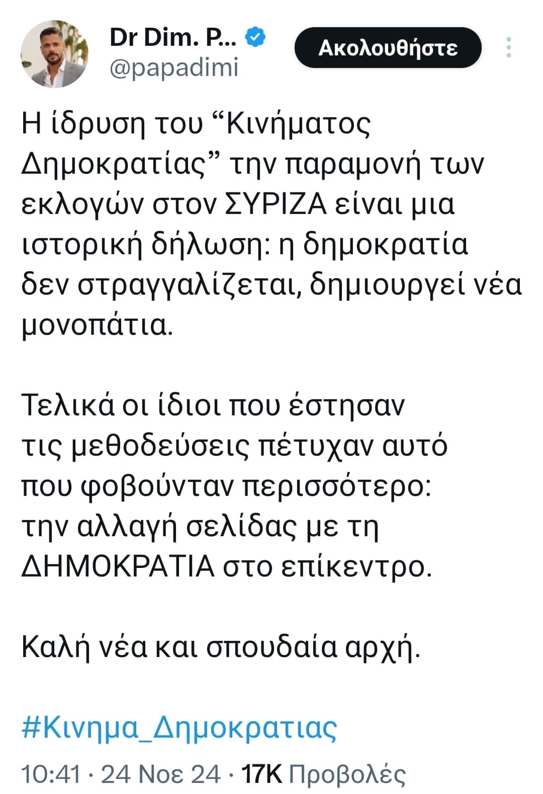 ✅Είναι τόσο το μένος τους κατά της Δημοκρατίας που ρίχνουν λάσπη σε έναν εξαίρετο επιστήμονα @papadimi που του ζητήθηκε αποκλειστικά η εξέταση της συζύγου του φερόμενου δράστη ως μέλος τριμελούς επιτροπής όπου κάθε πλευρά πρότεινε έναν επιστήμονα – και η δική του συμμετοχή… pic.twitter.com/sgkBDYw4uu